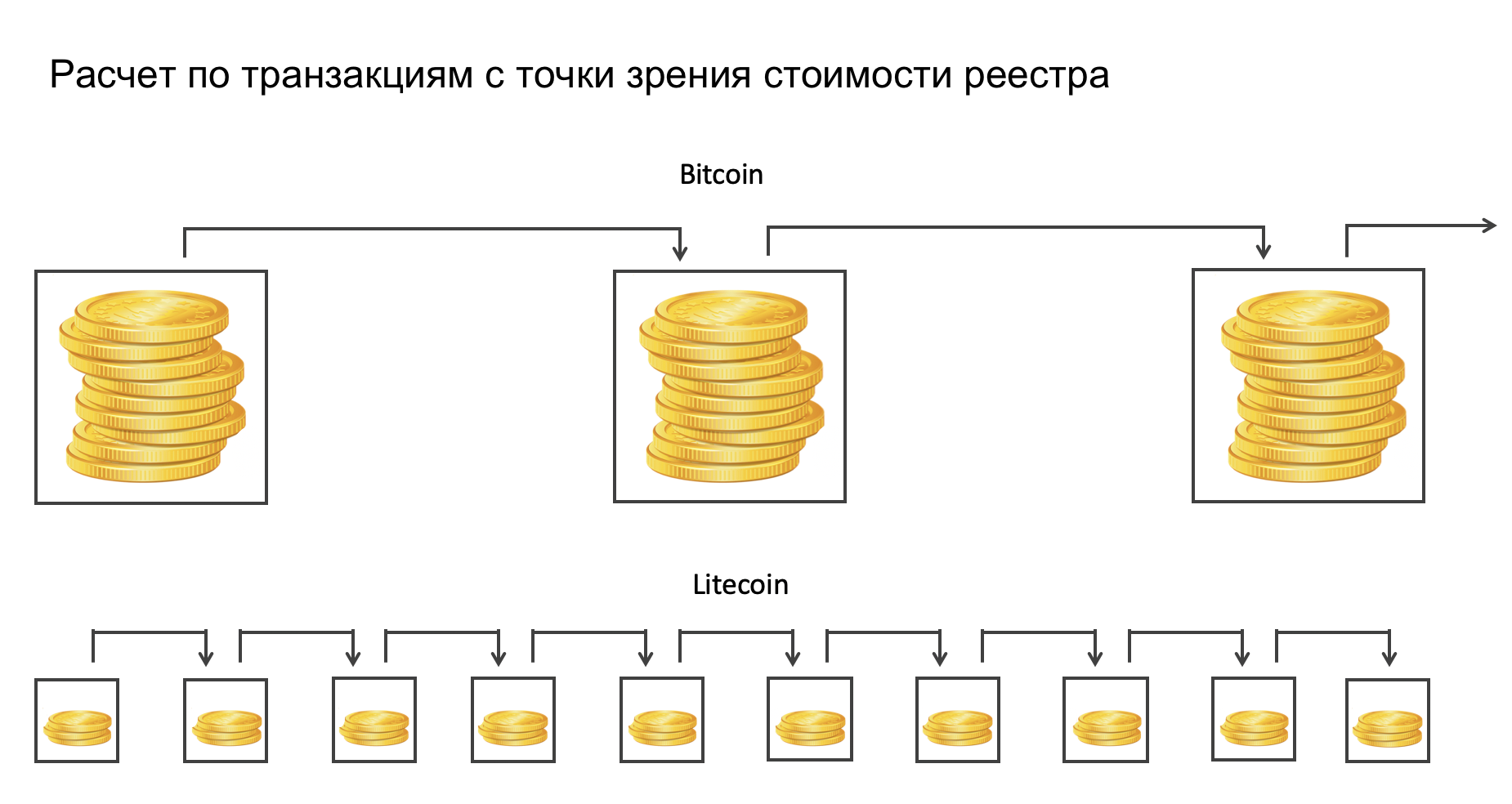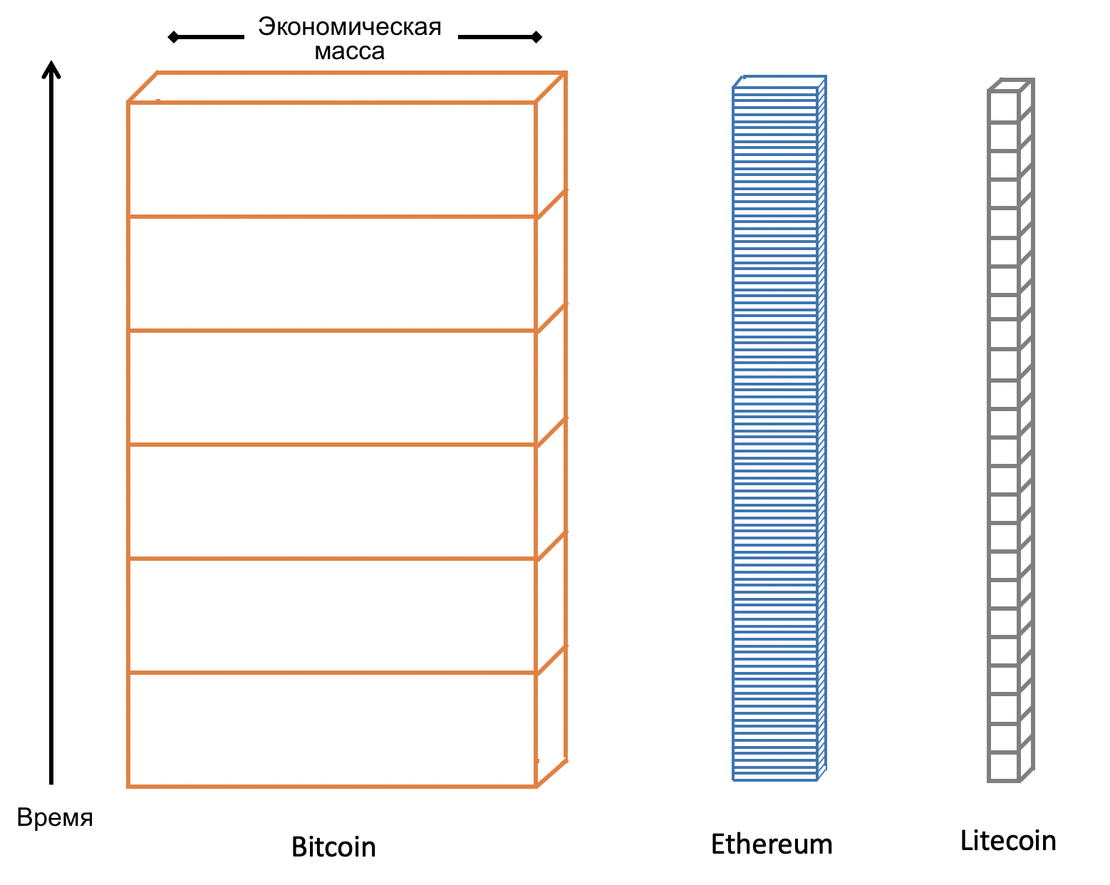 Единственное, что меняет меньший интервал между блоками, – это сокращает расхождения во времени ожидания первоначального подтверждения. Нетерпеливый человек, вероятно, отдаст предпочтению блокчейну с 2,5-минутным интервалом между блоками, но это совершенно не значит, что расчёт по транзакциям на нём будет происходить сколько-нибудь быстрее. Это никак не повлияет на скорость аккумулирования стоимости реестра, которая является функцией от темпа выпуска и цены монет.