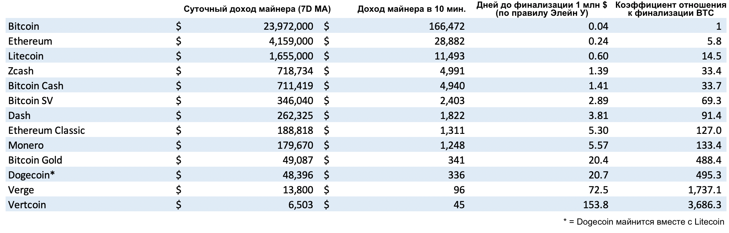 Теперь, когда мы назвали две наиболее важные для финализации переменные, давайте подставим цифры и сравним результат для крупнейших PoW-сетей.