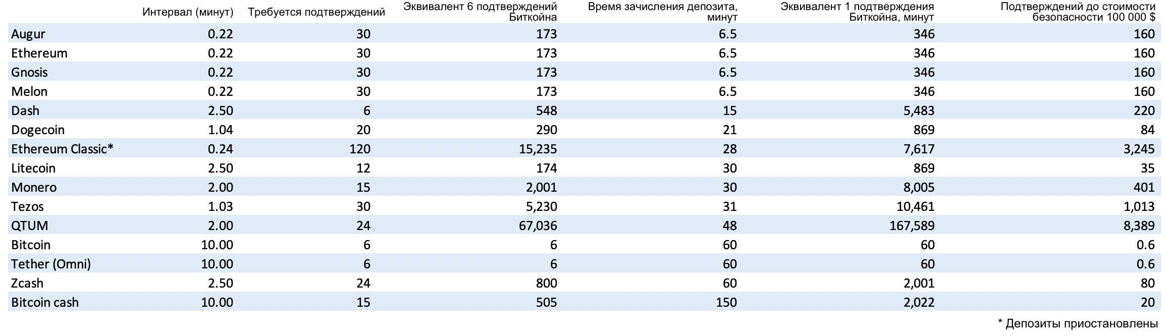 Удивительно, но из многих моих разговоров с представителями бирж, которым есть что терять от плохо сбалансированных правил расчёта по транзакциям, создаётся впечатление, что они обычно мало задумываются о правилах подтверждения. Я не смог найти детальной информации о том, через какое количество подтверждений биржи рассматривают входящие транзакции как финализированные. К счастью, Kraken опубликовал свои критерии.
