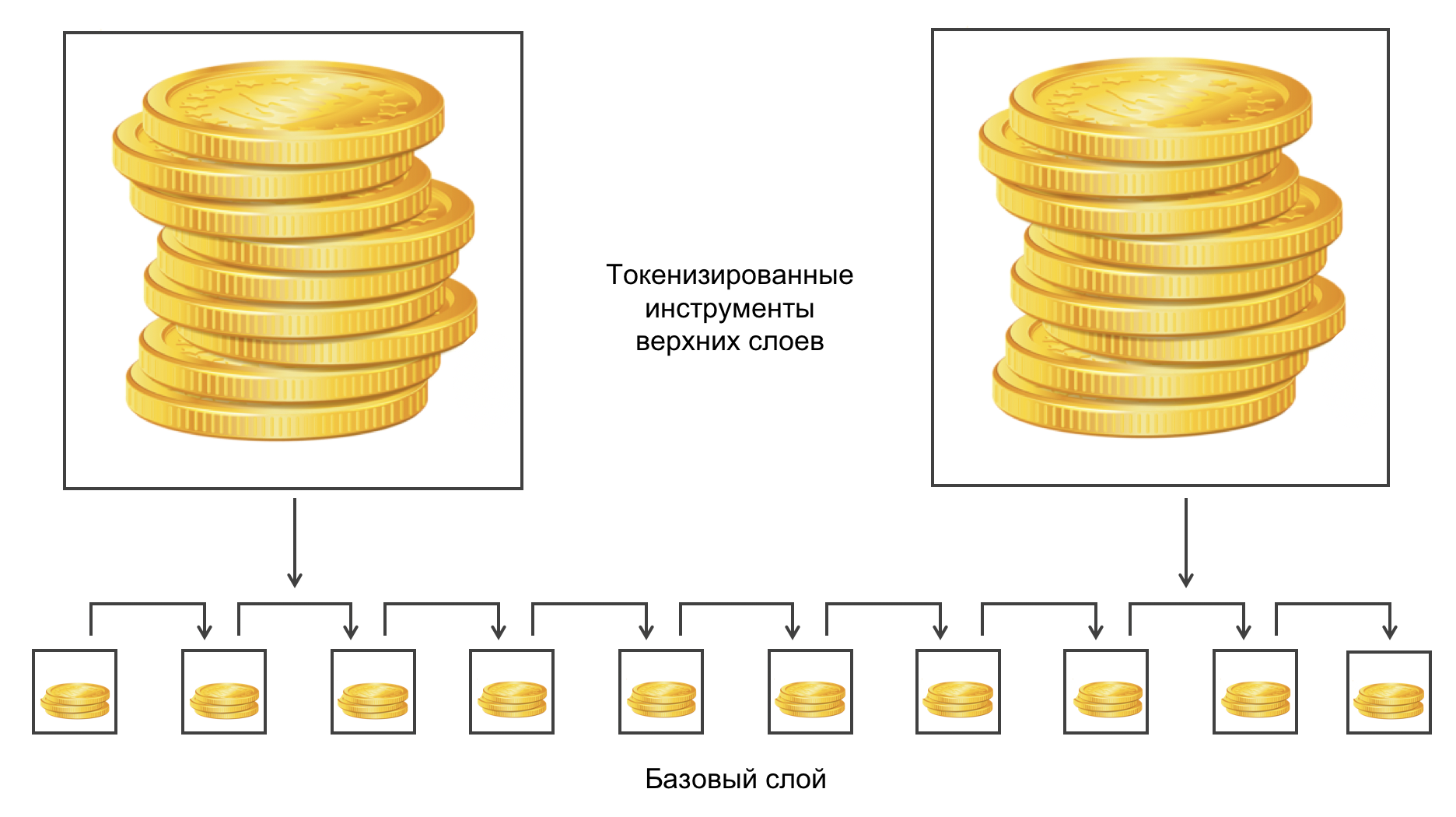 Это относится к состоянию, в котором большое количество финансово значимых активов создаётся в виде токенов поверх некоего протокола базового слоя – как активы Omni на Bitcoin или ERC20 на Ethereum. Поскольку эти токены наследуют свою безопасность от базового слоя и полностью от него зависят, они уязвимы для атак на базовый блокчейн.