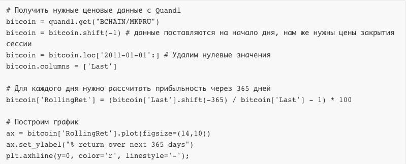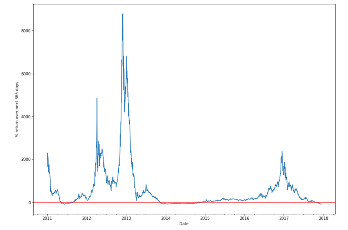Выбранный мной критерий позволяет построить график будущей (через 365 дней) доходности биткойна, наглядно показывающий неудачные периоды для покупки. Такой скрипт легко написать на Python.