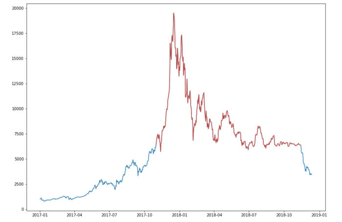 2018 г. Проводя этот эксперимент в декабре 2018, я решил исходить из предположения, что весь этот год до 13 ноября тоже будет относиться к неудачному периоду. Тринадцатого ноября цена BTC составляла около 6400 $, а затем за короткое время снизилась до 3400 $. Это означало бы 316 неудачных дней в 2018 году плюс 41 день в 2017 – в сумме 357 дней для последнего медвежьего рынка, что довольно близко к продолжительности неудачного периода 2013–2014 гг.