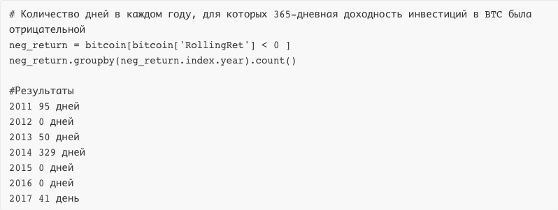 График скользящей 365-дневной доходности биткойнаИтак, вы можете видеть, что неудачным периодом для инвестирования в BTC оказалась часть 2011 года, а также конец 2013 и большая часть 2014 г., а затем период до конца 2017-го.