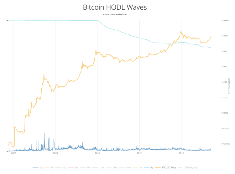 На графике выше показано, какой процент от общего числа UTXO находится в каком возрасте. Обратите внимание на резкий рост (в данном случае о нём говорит движение графика вниз) группы с возрастом 5 лет (5y), на которую теперь приходится более 20% от всех находящихся в обращении биткойнов (более 30 млрд на сегодняшний день).
