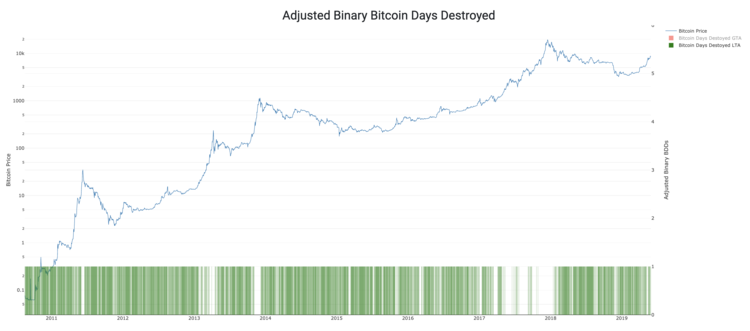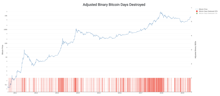 Для того чтобы минимизировать искажение из-за перемещений монет между биржевыми кошельками, не отражающих поведения ходлеров, мы взяли среднее значение BDD за всё время и задали себе простой вопрос: «Было ли сегодня уничтожено больше биткойн-дней (по скорректированной метрике), чем в среднем за всё время?» Ответ на этот вопрос можно увидеть ниже: красными свечами выделены дни, для которых он был утвердительным.