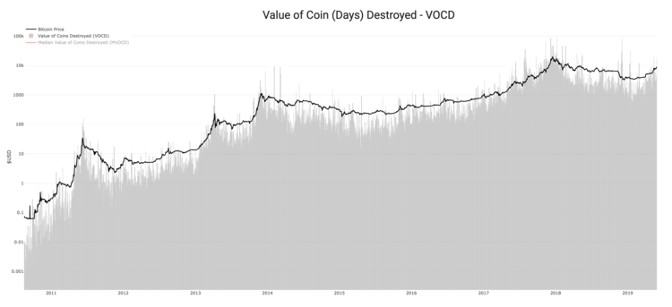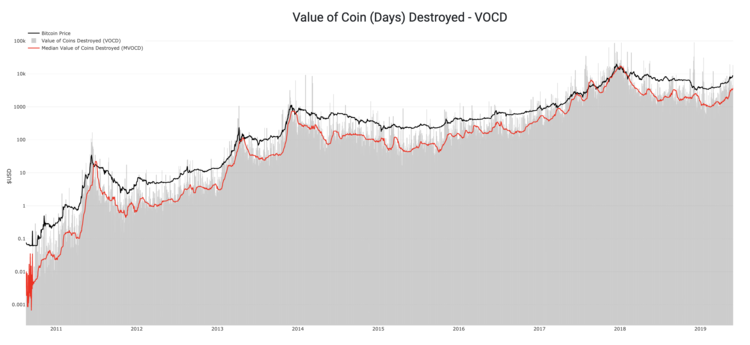 Если BDD исчисляется в биткойнах, то VOCD – в долларах. Когда серая линия оказывается выше чёрной, это значит, что VOCD больше цены биткойна или что в этот день было разрушено больше BDD, чем создано.