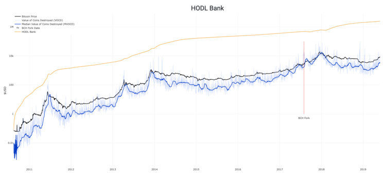 Суммировав совокупный долларовый эквивалент удерживаемых биткойнов с течением времени, вы получаете совокупную альтернативную стоимость, созданную в течение всего срока существования сети Биткойна за счёт решения пользователей удерживать биткойны вместо того, чтобы их продавать. Это HODL-банк.