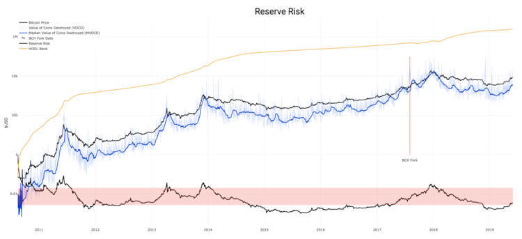 Это можно измерить, разделив цену биткойна в любой момент времени на его HODL-банк. Таким образом мы получаем то, что мы назвали риском резерва (Reserve Risk).