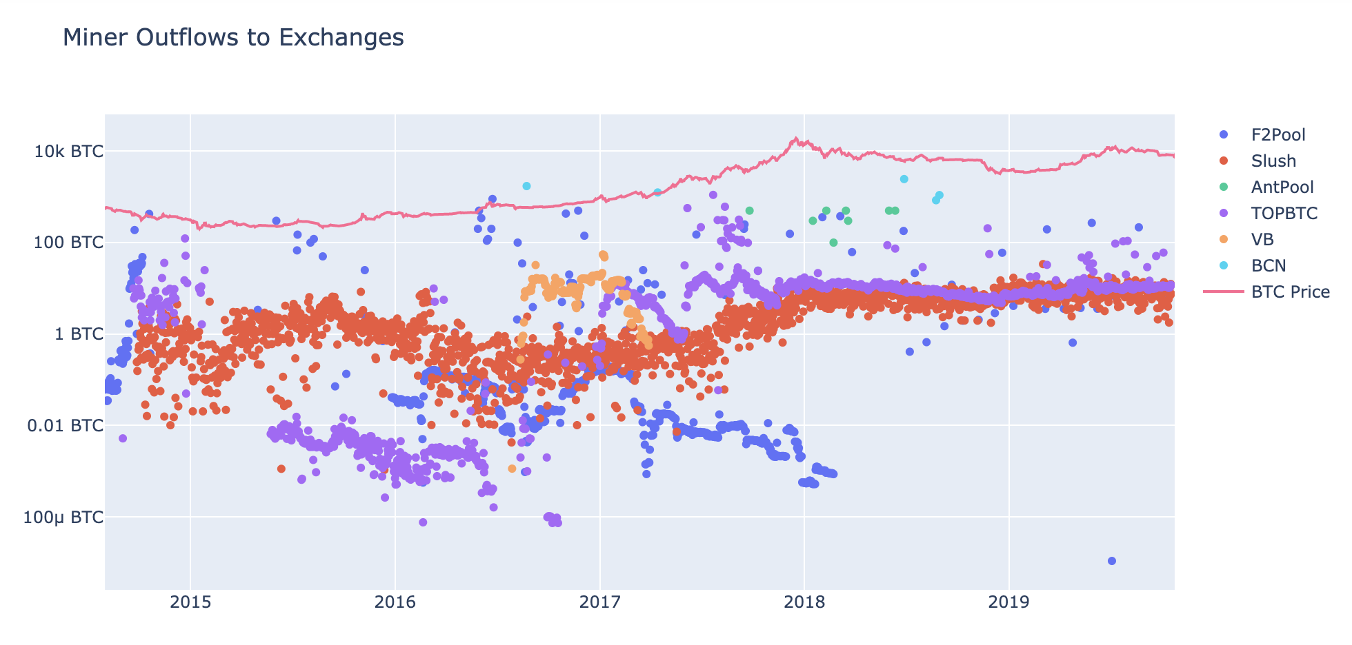 Мы приводим здесь Slush и TOPBTC, потому что (1) это наиболее активные пулы в наборе данных и (2) та же диаграмма для общего оттока BTC, как представляется, содержит ещё меньше сигналов.