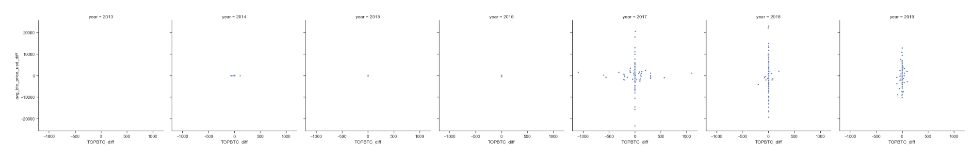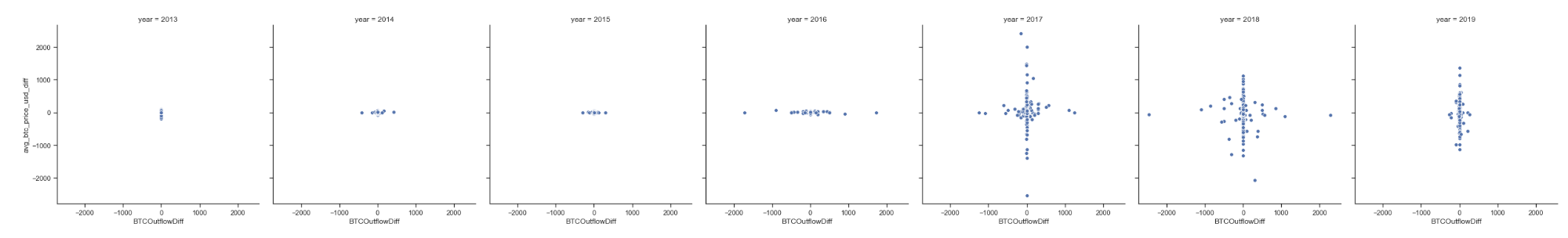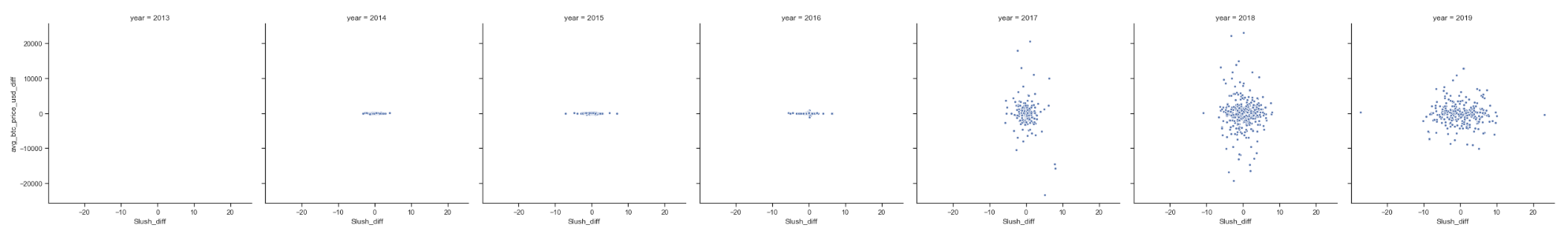 В случае корреляционных диаграмм рассеяния – как те, что представлены ниже – мы обычно хотим иметь возможность определить, что «в случаях, когда отток BTC от майнеров увеличивается, цена снижается» (либо обратное, или вообще хоть что-то различимое).