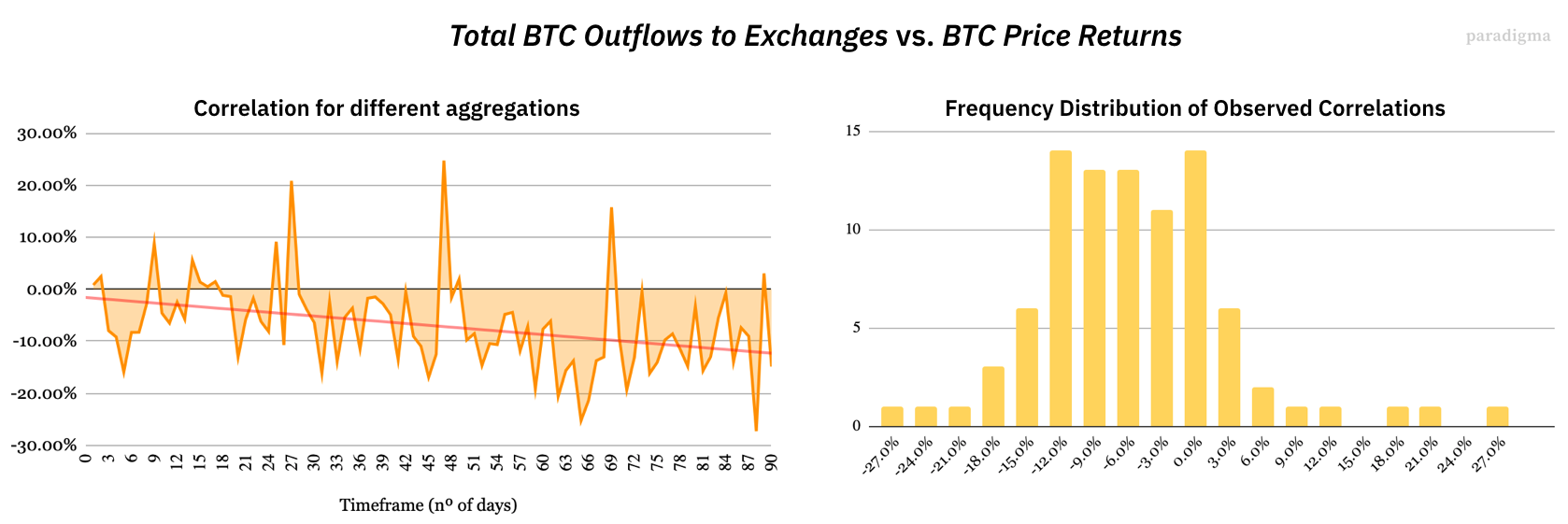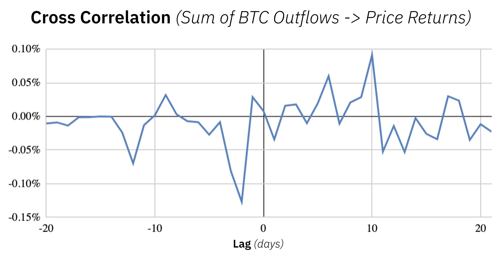 Наконец, мы проверили разницу в суммах оттока BTC на взаимную корреляцию с ценовым доходом, однако значимых сигналов нам выявить не удалось, независимо от выбранного временного лага.