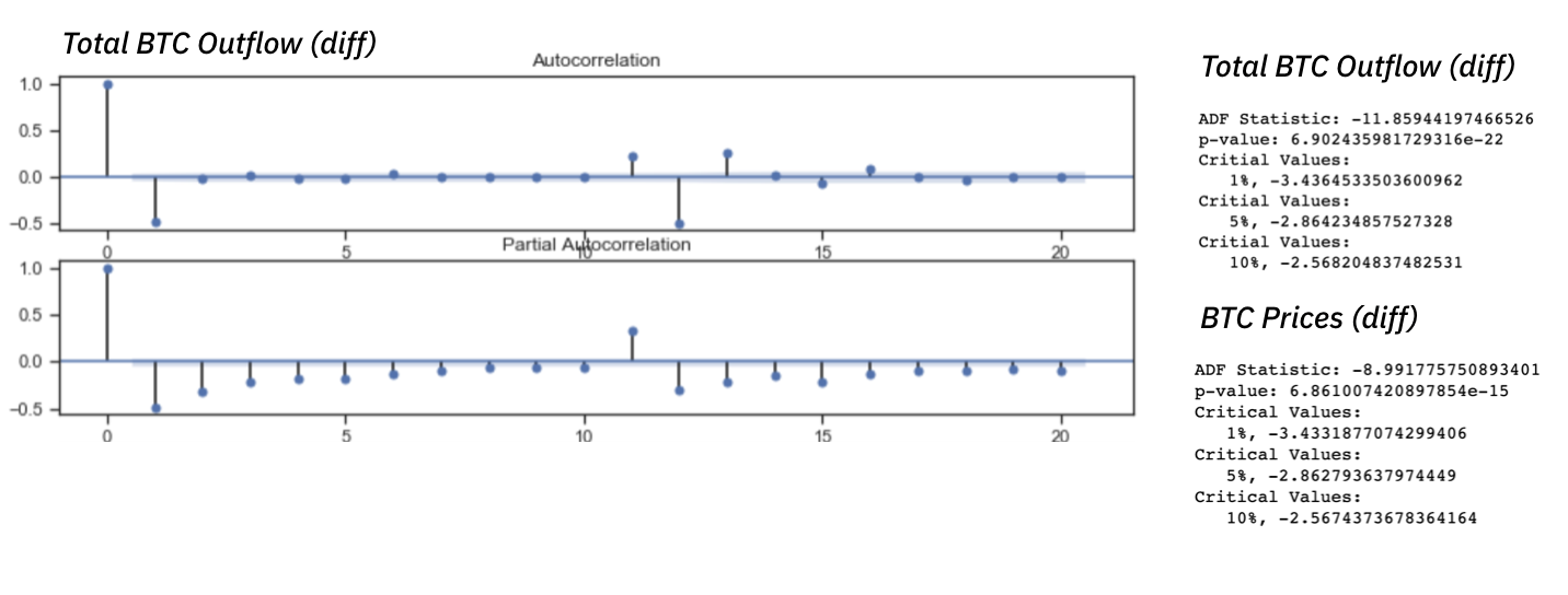 После дифференцирования (1-го порядка) рядов и проверки на стационарность, мы стали искать любые значимые связи между любыми движениями размеченных пулов и поведением цены биткойна.