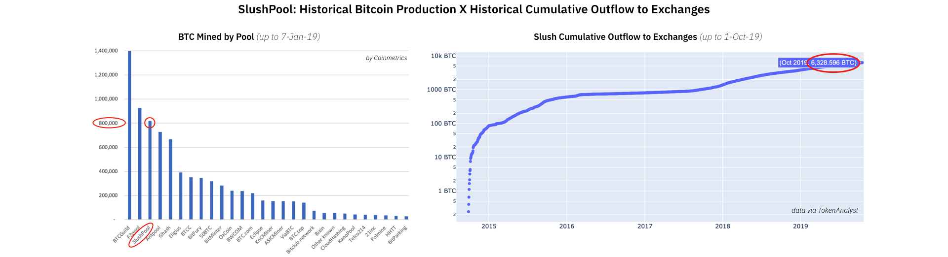 Мы можем попробовать вывести аналогичную степень недопредставленности, сравнив общий размеченный отток с адресов Slush – это пул с наиболее постоянной активностью из представленных в наборе данных – на биржи с альтернативной оценкой количества BTC, которое намайнил этот пул за время существования.