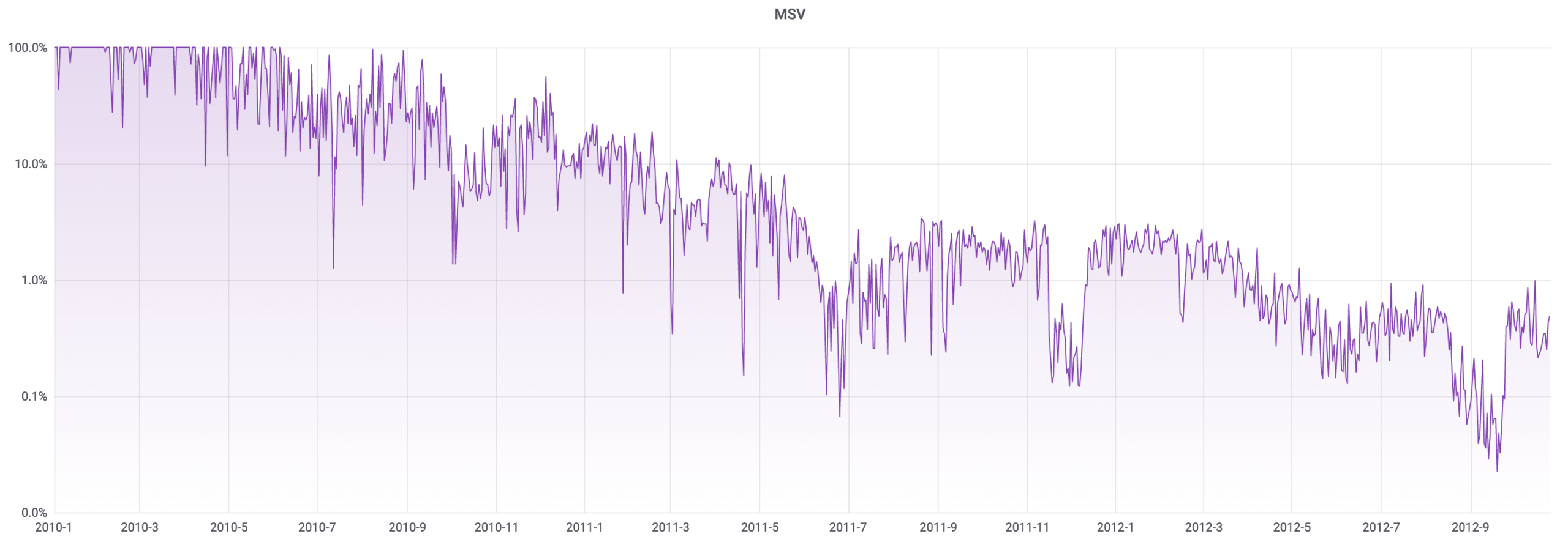 MSV, равный 0,01%, означает, что, если майнер-монополист единовременно реализует на рынке coinbase-выходы, полученные за три месяца (без учёта скорости изменения курса), этот объём составит 1/100 часть от дневного объёма ончейн-транзакций.