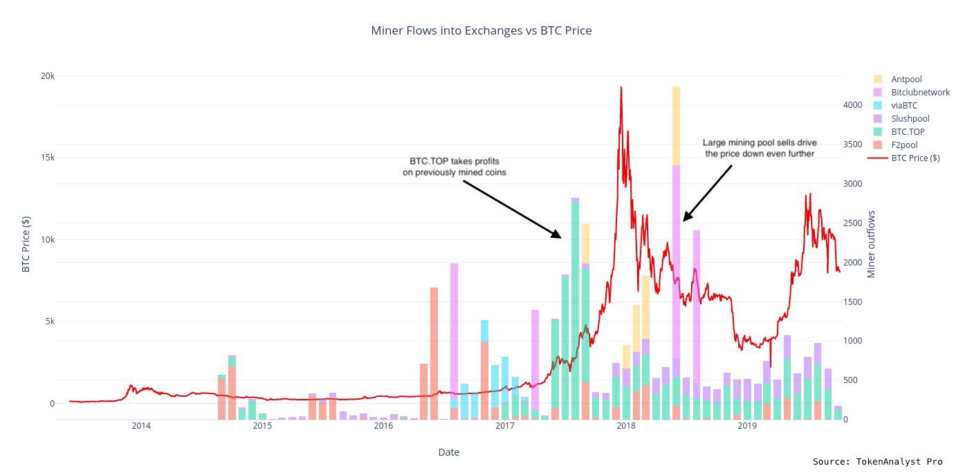 На первый взгляд, прямолинейное описание месячного оттока биткойнов от майнеров на адреса бирж может выглядеть весьма многозначительно: