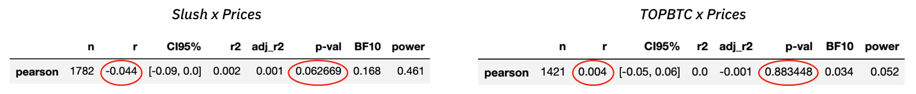P-значение, равное 0,062, указывает на ~94% вероятность того, что очень слабая отрицательная корреляция между оттоком с BTC-адресов Slush и ценовым доходом не продукт случайности. Ещё меньший коэффициент корреляции для TOPBTC не стоит даже принимать во внимание из-за его невероятного p-значения.