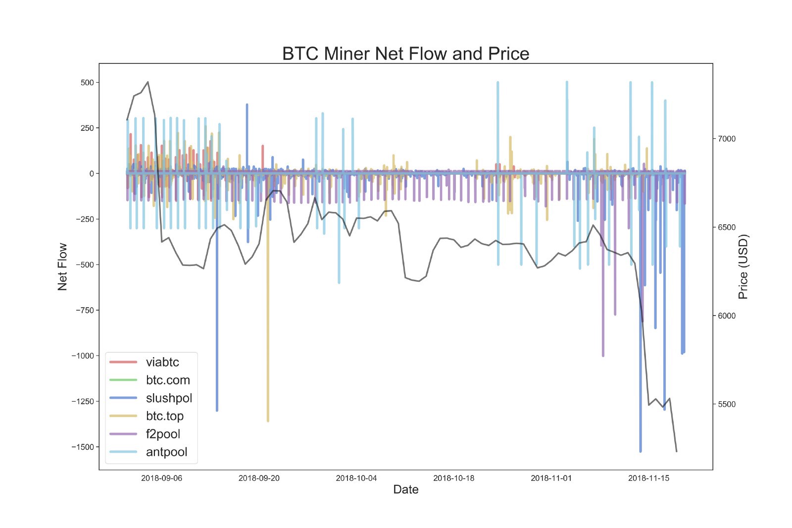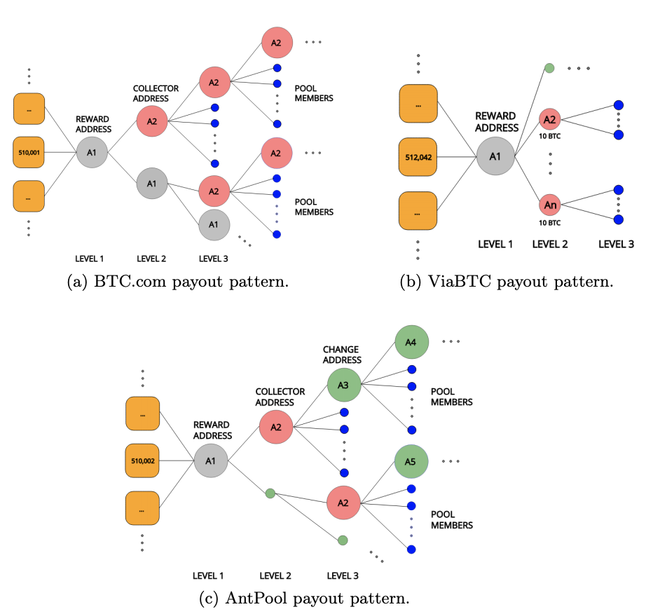 Размеченные потоки включают транзакции от Antpool, BTCTOP, BitClubNetwork, F2Pool, Slush и ViaBTC на биржи Bitstamp, Bittrex, Binance, Bitfinex, BitMex, Huobi, Kraken и Poloniex.