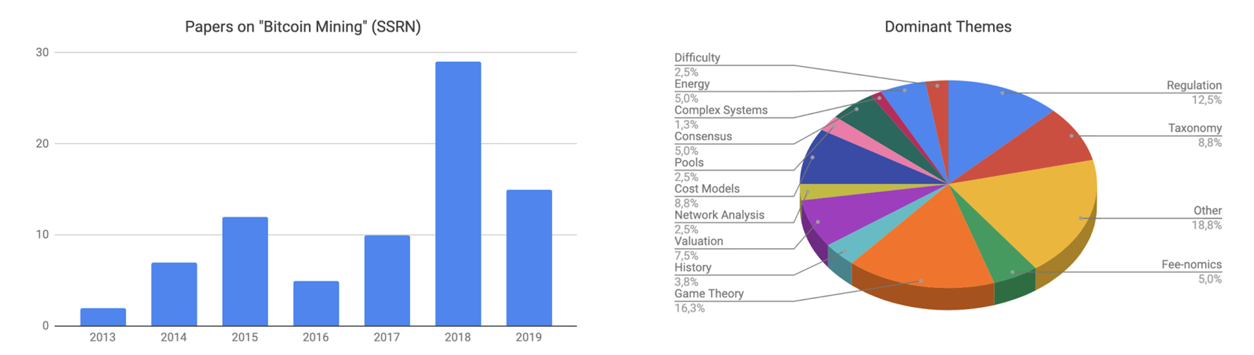 Большая часть экономического анализа майнинговой деятельности до сих пор была направлена на решение двух ключевых вопросов: (1) как моделировать теоретико-игровое соревнование, коим является майнинг?; и (2) как составить карту майнинговых пулов, чтобы отслеживать их мощность и/или поведение?