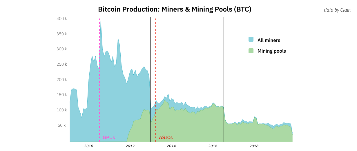 Хорошо задокументированный переход от любительского к профессиональному майнингу отчётливо виден на этой диаграмме: