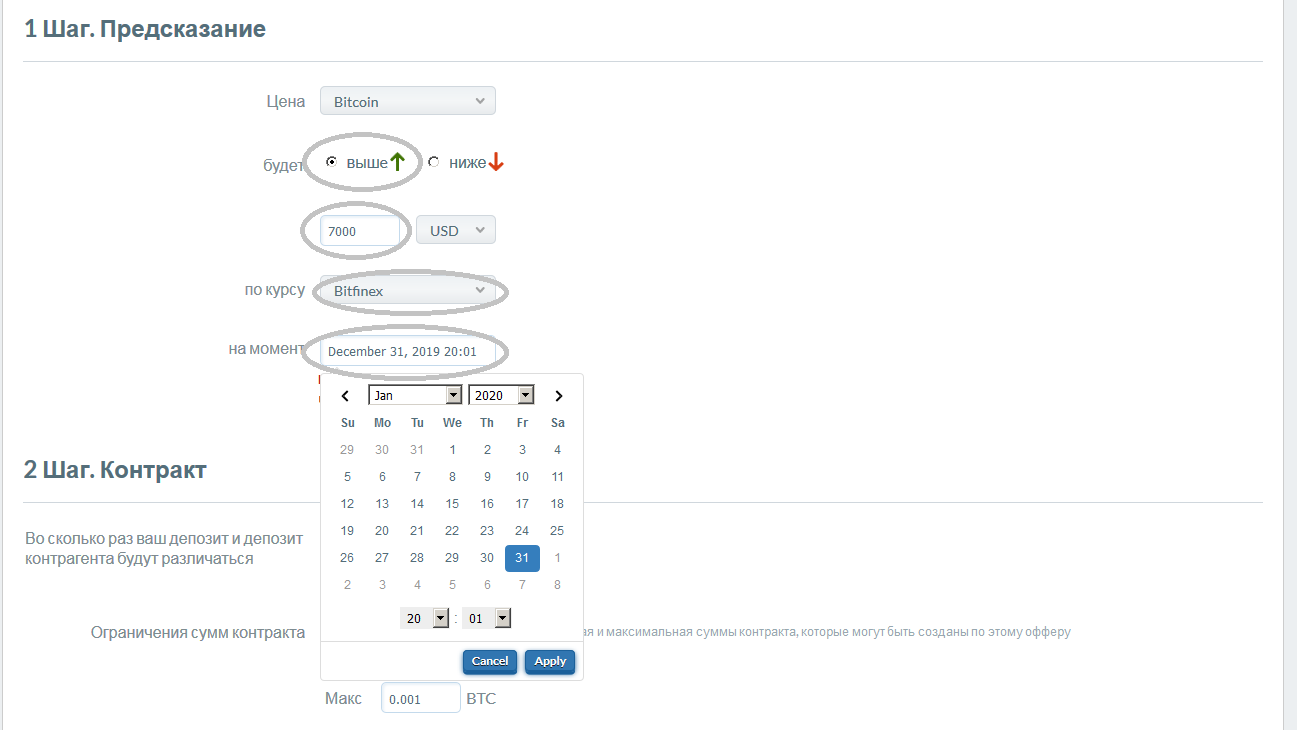 Необходимо выставить предсказываемый курс BTC/USD, также выбрать биржу — Bitfinex. Время предсказания нужно поставить по UTC, то есть -4 часа от московского: 20:01, 31 декабря 2019.