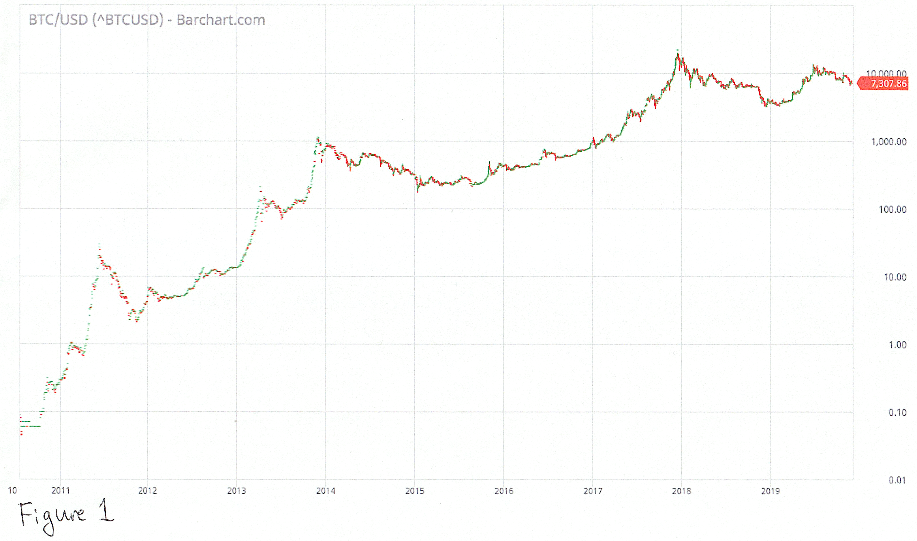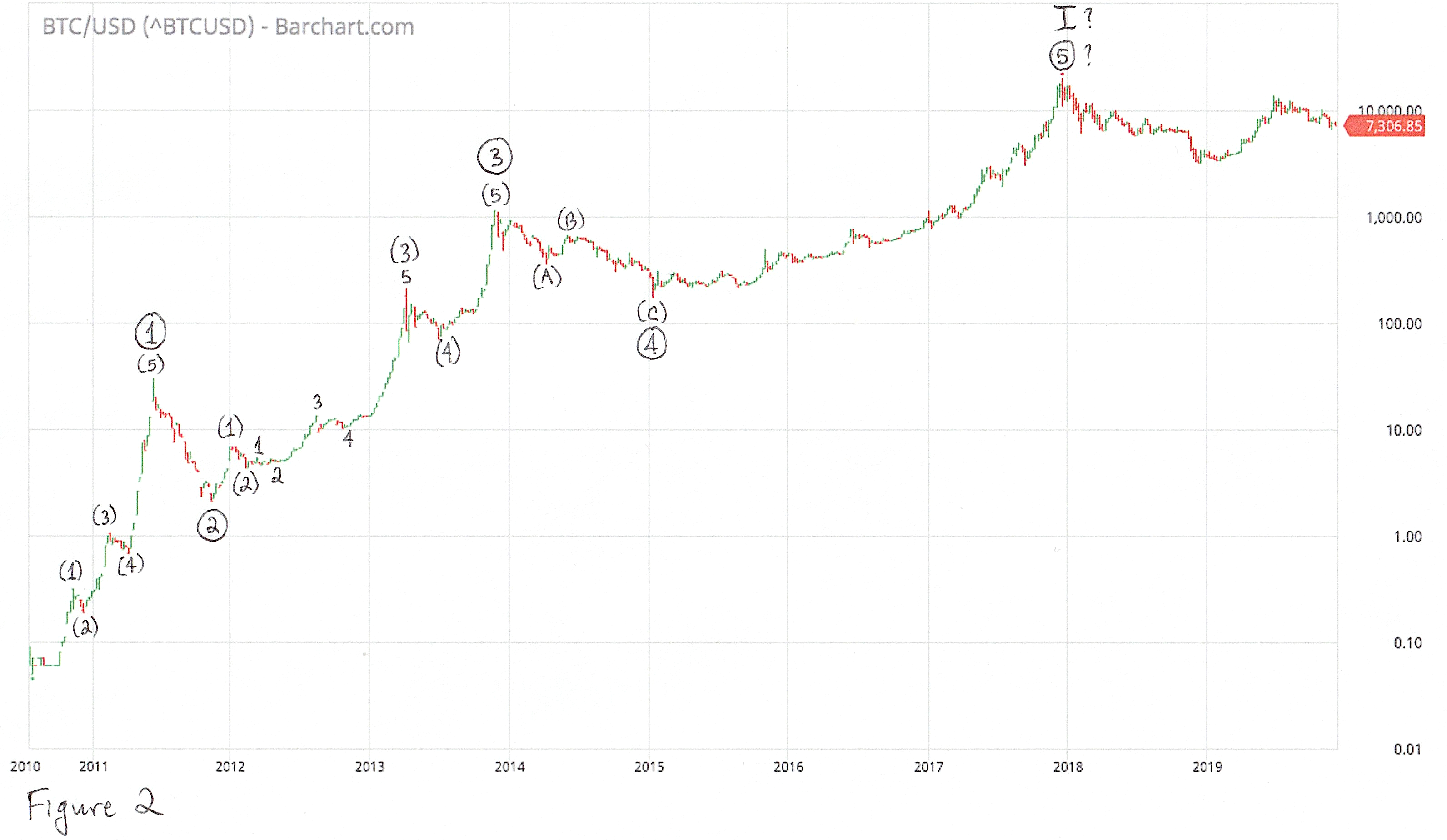 Мы будем рассматривать графики курса биткойна к доллару (см. рис. 1), потому что наибольший торговый объём на протяжении всей истории Биткойна был именно в долларовых парах. Выбранный мной метод анализа, волны Эллиотта, основан на психологии масс (я рассказывал об этом в предыдущем посте), так что чем больше объём рынка, тем лучше.