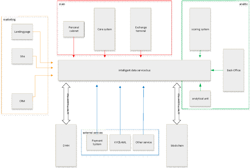 Главным каналом передачи информации между потребителями и хранилищем выступает модуль «интеллектуальная шина передачи данных». Введение в архитектуру этого модуля и модуля DWH (хранилище данных), фактически снимает нагрузку с базовой системы и позволяет аналитическому модулю без ограничений получать для анализа текущую и историческую информацию. Вторая схема – это идеализированная версия биржевой архитектуры, но всегда есть, к чему стремиться.