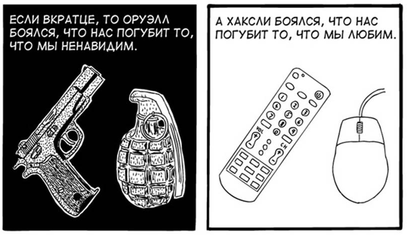 Мир Хаксли был миром апатии. Мир Оруэлла был миром страха. Мир Хаксли был представлен удовольствием, происходящим от сладкой сомы и погоней за удовлетворением примитивных, базовых желаний. Мир Оруэлла был миром боли или так называемого «ботинка, вечно наступающего на лицо человечества». Мир Хаксли утонул в бесполезной информации, где никто не заботился о фактах, особенно, неприятных. В мире Оруэлла — информация была ограниченной и подконтрольной.