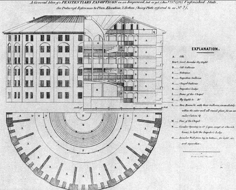 Паноптикум, в первоначальной задумке, представляет собой дизайн тюрьмы, разработанный рационалистом, философом и юристом — Джереми Бентамом и подробно описан в его трудах от 1978 года. (прим.переводчика. По некоторым сведениям, идея была предложена Самюэлем Бентаном — братом Джереми).