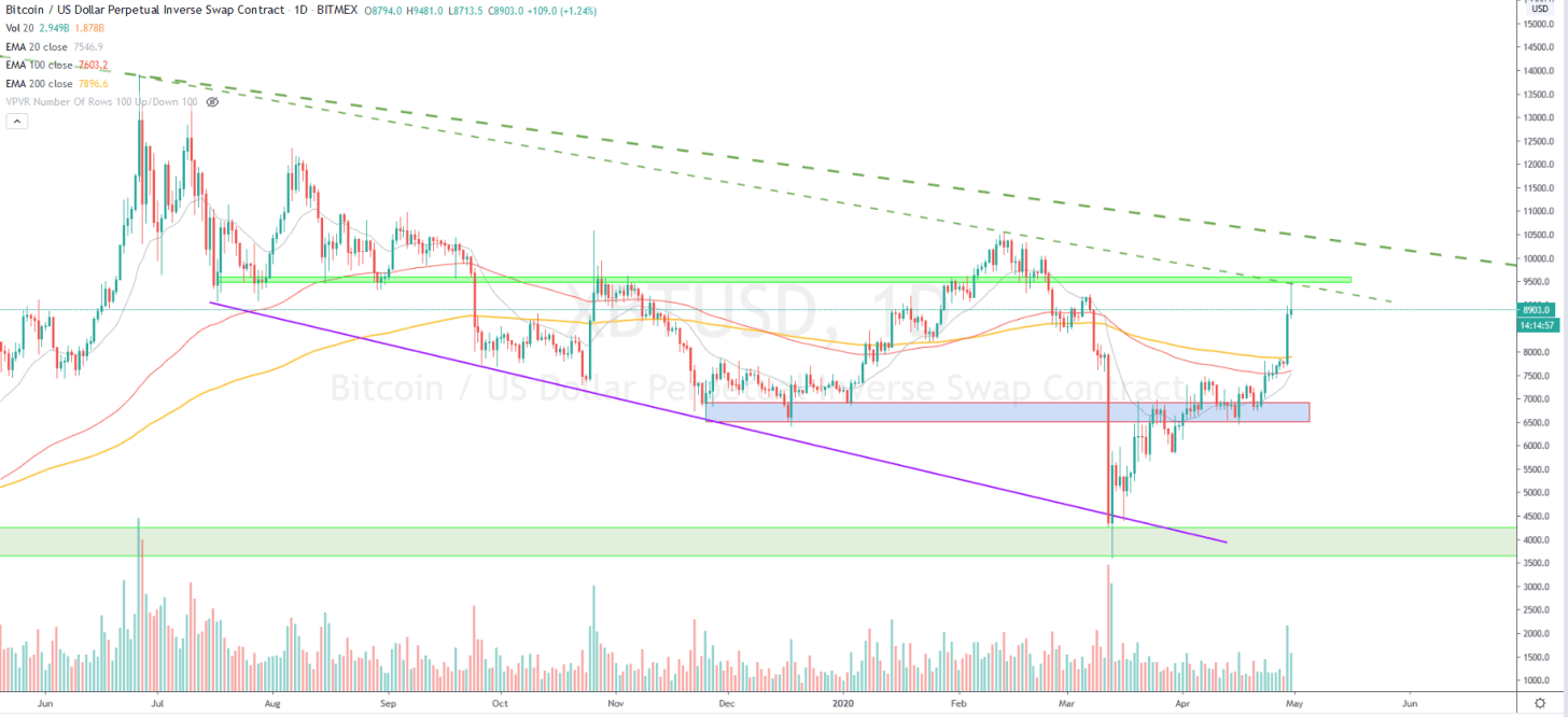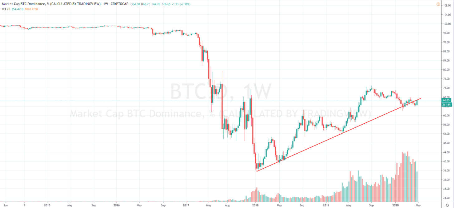 До халвинга остается недели полторы, и рынок находится в критической точке. На альтах этот внезапный прорыв BTC, конечно, сказался не лучшим образом. Индекс доминирования Биткойна тестирует снизу пробитую только что линию тренда, и лишь считаные единицы альткойнов в эти пару дней не упали по отношению к BTC.
