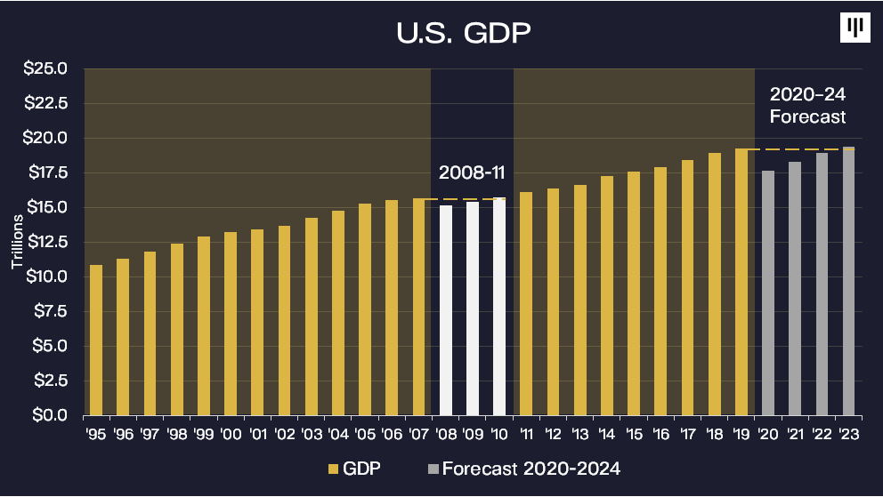Наш старший советник и мой бывший партнер по Tiger Management Рон Глэнц считает, что во втором квартале реальный ВВП упадет на беспрецедентные -41% в отношении годового темпа с учетом сезонных колебаний (SAAR), в сравнении с -5,0% SAAR в первом квартале. И хотя экономика должна восстанавливаться исторически высокими темпами, начнем восстановление мы настолько далеко от прежнего уровня, что, вероятно, потребуется четыре года на то, чтобы ВВП вернулся на те уровни, на которых он был в четвертом квартале прошлого года, перед тем, как вирус поразил нашу экономику.