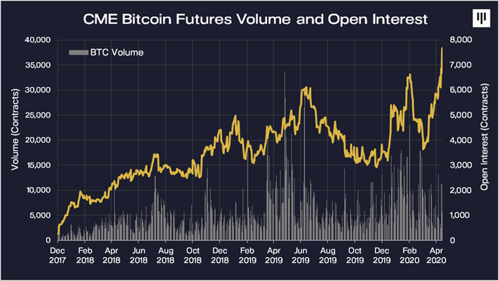 Объемы торгов фьючерсами на биткойн на CME могут служить замещающей переменной для уровня интереса институциональных инвесторов к Биткойну, и этот показатель растет. Открытый интерес по этому рынку в последнее время вырос до рекордных значений.