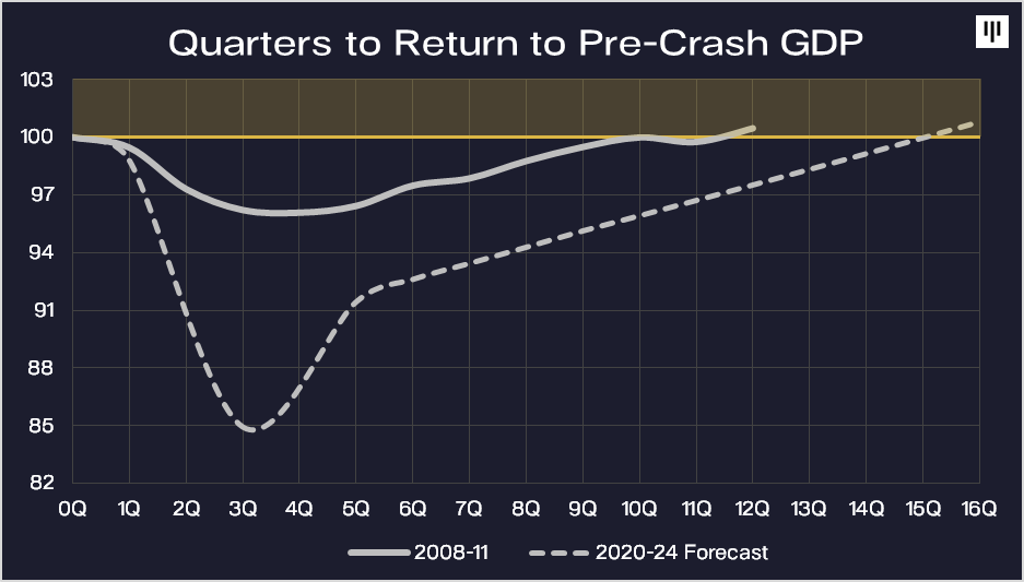Точно так же и восстановление годового ВВП до уровней прошлого года, как представляется, займет те же четыре года.