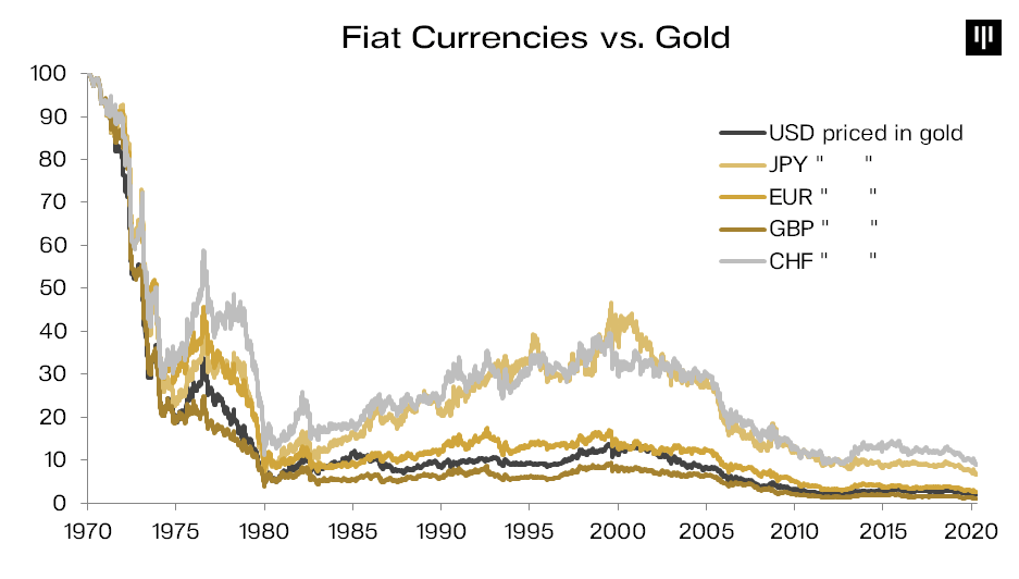 Божества могут просто приказать – и все будет сделано. Смертные так не могут. Вы не можете приказать, чтобы фиатные валюты имели или, точнее, сохраняли свою стоимость. Чем больше смертных связывается с фиатными валютами, тем больше те теряют свою покупательную способность. На графике ниже показана стоимость основных фиатных валют по отношению к золоту – активу/элементу, количество которого не может быть увеличено по чьей-то воле.