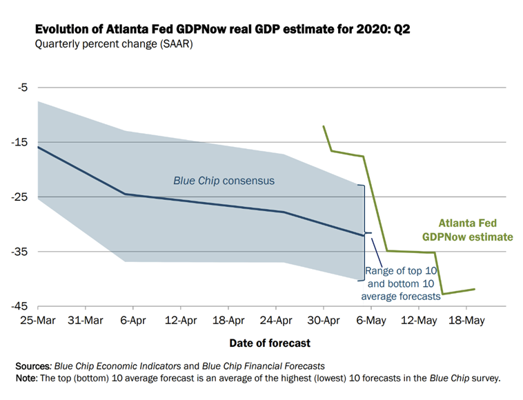В качестве отступления, есть очень хорошо выполненный график от Федерального резервного банка Атланты, показывающий изменение в мышлении среди экономистов и сопоставленный с оценкой ВВП ФРС Атланты в реальном времени. Эта оценка основана на таких экономических данных, как потребительские расходы, чистый экспорт и государственные расходы. Экономисты довольно медленно приходили к пониманию масштабов этого кризиса. Однако весь спектр текущих прогнозов экономистов все еще находится выше той точки, где 10 самых пессимистичных экономистов касаются прогноза ВВП ФРС Атланты.