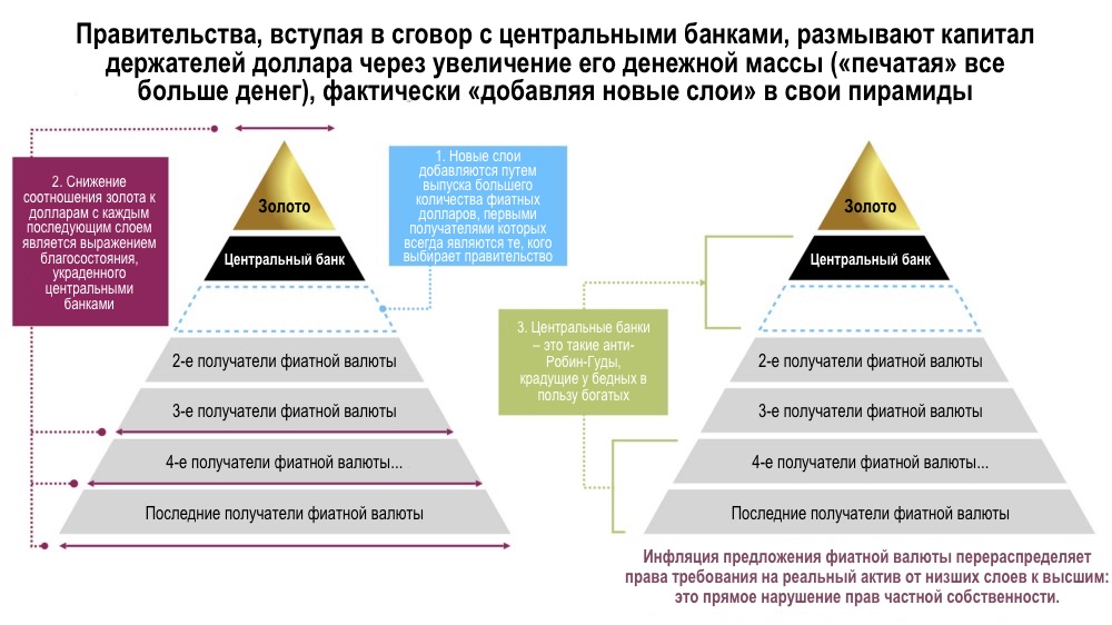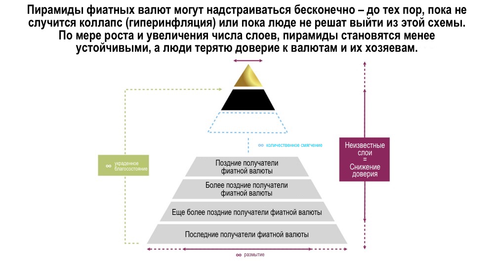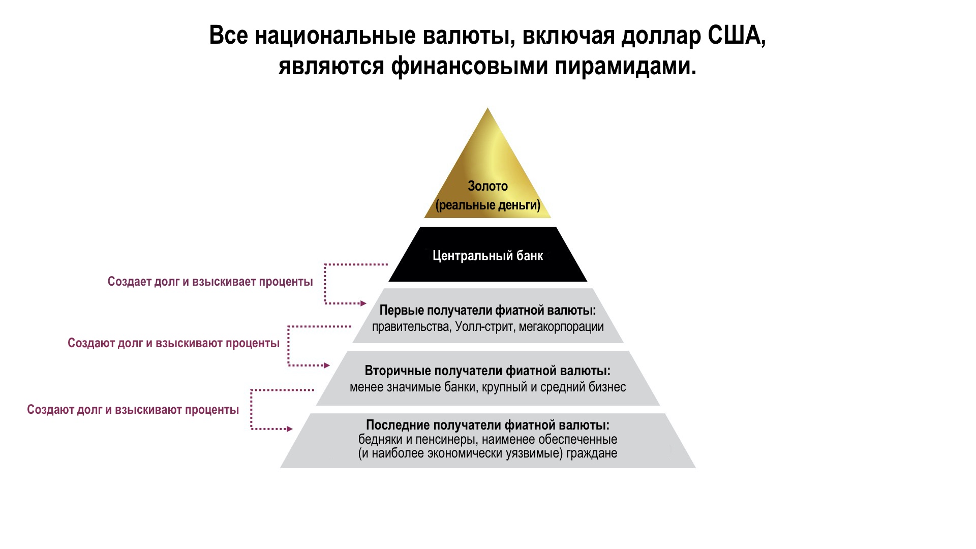 В результате систематизированного многоходового мошенничества правительств эти финансовые пирамиды стали доминировать в мире. Фиатные валюты — это основанные на долговых обязательствах заменители денег, которые контролируются центральными банками, навязывающими эти денежные сети пользователям и принудительно (или насильственно) подавляющими любую конкуренцию на этом рынке. Самое отвратительное, что больше всего от этой мошеннической системы страдают именно самые бедные члены общества, которые (по необходимости) держат большую часть своего благосостояния в фиатной валюте.