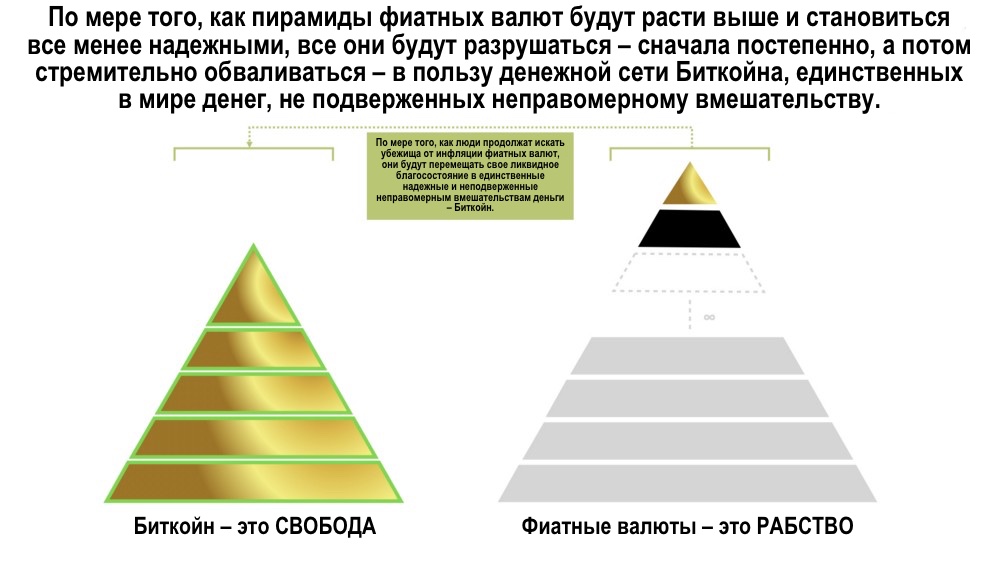 До тех пор, пока люди остаются достаточно пассивными и при этом достаточно продуктивными, эти финансовые пирамиды могут продолжать строиться выше и выше и продолжать действовать как орудие перераспределения доходов (кражи времени) в пользу организаторов этих систем. Однако за все так или иначе приходится платить, и такое увеличение денежной массы фиатной валюты не может продолжаться вечно. По мере того как, раунд за раундом «количественного смягчения», слои финансовой пирамиды продолжают накапливаться и люди все сильнее облагаются неявным налогом в виде инфляции цен, доверие к валюте уменьшается. Как Хемингуэй сказал о банкротстве, это происходит сначала постепенно, а потом внезапно, когда инфляция сменяется гиперинфляцией: полное разрушение экономического доверия, которому деньги призваны способствовать в первую очередь. В этот момент «хозяин – центральный банк» нанес слишком сильный удар по «гражданам – фиатным рабам», и они наконец достигли края своей экономической жизни.