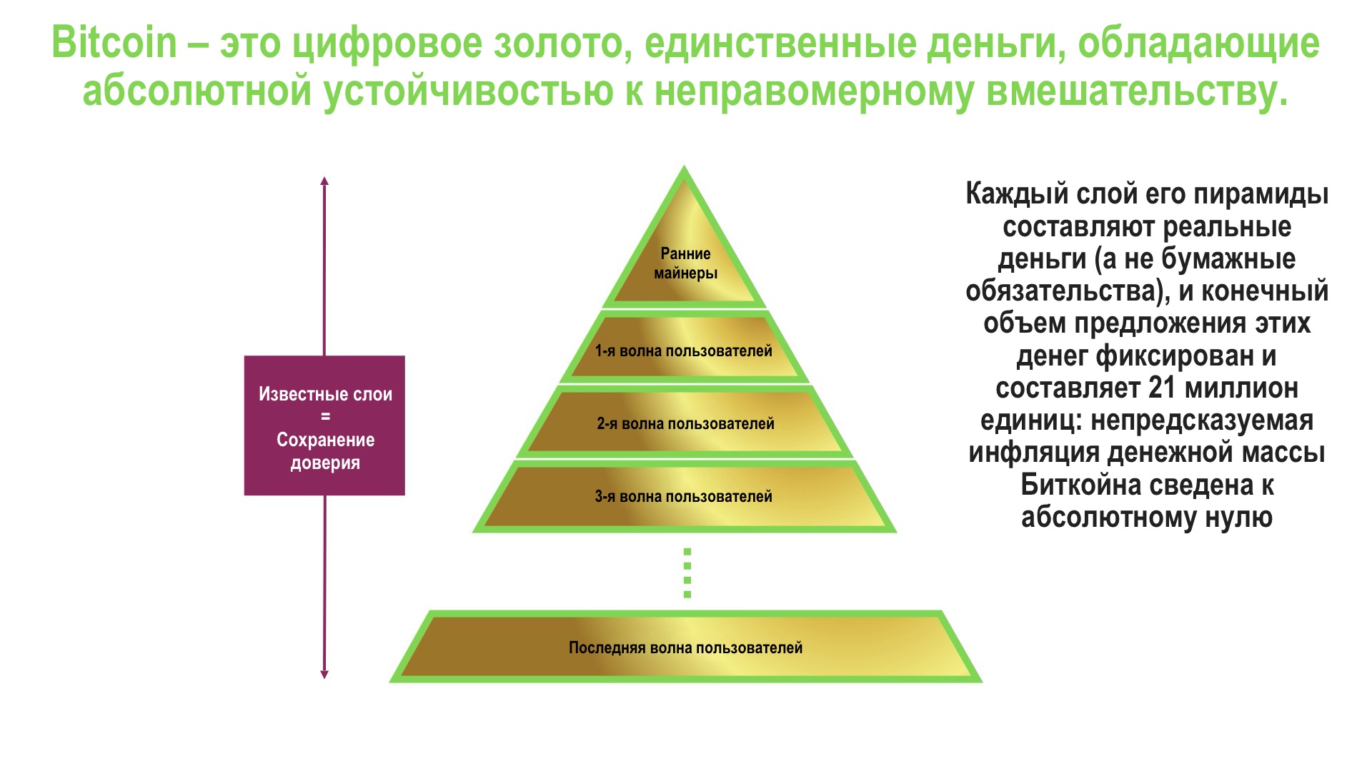 Эта пирамида «цифрового золота», в основании которой лежат неизменные слои, затмевает фиатные валюты с присущей им неопределенностью. Поскольку деньги являются «страховкой от неопределенности», спрос на них основывается на относительной определенности их денежных свойств; и Биткойн оптимизирует все пять основных свойств денег: он демонстрирует делимость, долговечность, портативность, обладает узнаваемостью чистой информации и дефицитностью времени. Как смерть и налоги, определенность ограничения в «21 миллион биткойнов» — это концепция, которую невозможно опровергнуть. Сочетаясь со стимулом к опережающему будущему принятию этих цифровых, абсолютно дефицитных и защищенных от кражи денег, это наделяет Биткойн теоретико-игровой гравитацией, от которой рынок денег просто не может убежать. Парадоксальным образом, именно эта неизбежность ведет к освобождению все большего числа фиатных рабов по всему миру.