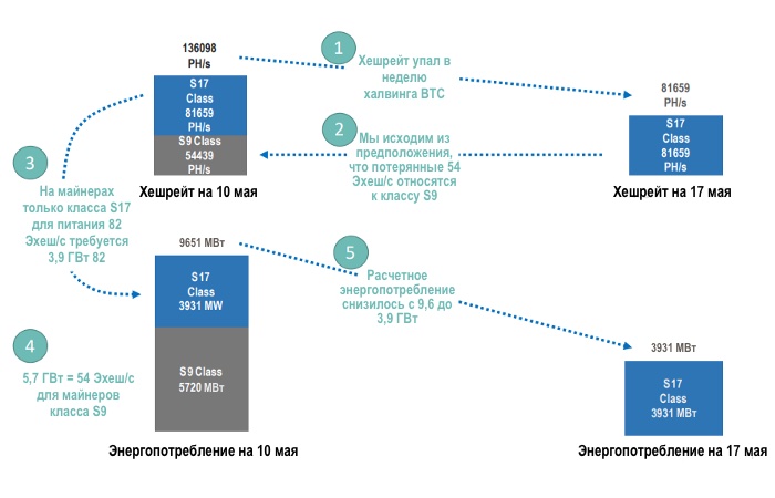 Наша оценка основывается на следующей логике: 10 мая, как раз перед халвингом, хешрейт Биткойна достиг 136 098 петахеш/сек. и 17 мая упал до 81 659 петахеш/сек. Мы признаем, что в некоторой степени эти крайние значения могли зависеть от простой случайности – так ряд удачно и быстро найденных блоков мог искусственно завысить расчетное значение хешрейта, равно как и снижение скорости нахождения блока отчасти тоже может быть следствием случайности. Тем не менее мы исключаем этот фактор случайности из нашей модели и делаем упрощающие предположения, чтобы получить приблизительное представление о том, сколько энергии потребляет сеть Биткойна. Мы здесь исходим из предположения, что источником всего хешрейта, оставшегося после снижения до минимумов 17 мая, является более прибыльное, новое поколение оборудования, принадлежащее к «классу S17», который включает в себя Antminer S17 и T17 от Bitmain, Whatsminer M20, а также устройства от Canaan, Innosilicon, Ebang и др. Мы также предполагаем, что все устройства, отключенные от сети между 10 и 17 мая, принадлежали к более старым поколениям менее прибыльного оборудования класса S9 (как Antminer S9 и Whatsminer M3).