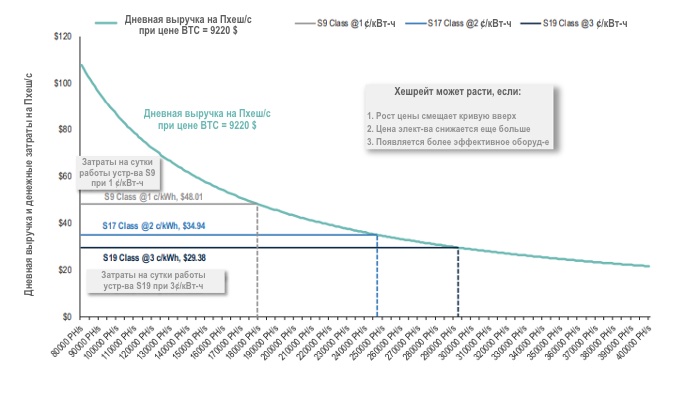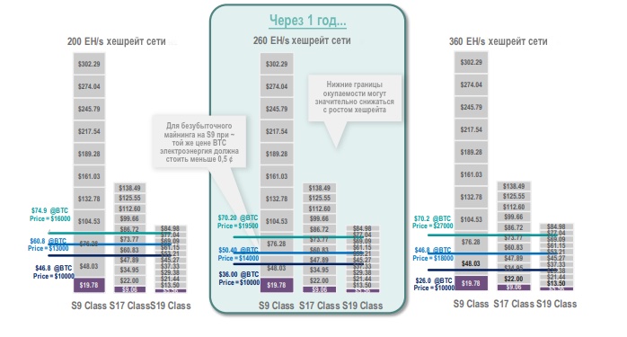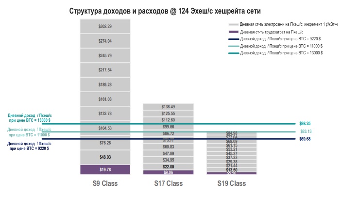 Обращаю ваше внимание на то, что мы используем обозначения «класс S17», «класс S9» и «класс S19» в качестве категорий, которые включают в себя как устройства от Bitmain, так и оборудование конкурирующих производителей, обладающее аналогичными характеристиками. Мы обозначаем названия классов через модели Bitmain, потому что они являлись доминирующим игроком на рынке оборудования «класса S9» и, в меньшей степени, «класса S17». Кроме того, во всех соответствующих расчетах мы исходим из значения PUE (Power Usage Effectiveness, эффективность энергопотребления) 1,12, что означает, что на каждый 1 МВт, расходуемый непосредственно на майнинг Биткойна, еще 120 КВт расходуется на поддержание всей сопутствующей инфраструктуры, включая системы охлаждения, освещение, серверы, коммутаторы и т. д.