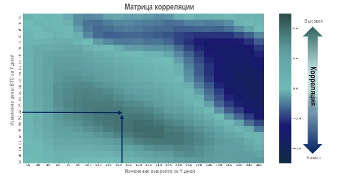 Мы рассматриваем корреляцию изменений цены в течение периода от 15 до 360 дней с изменениями хешрейта за тот же период прошлого года. Мы отметили, что хешрейт с высокой корреляцией следует за ценой с отставанием в 4–6 месяцев. Это создает динамику накопления капитала с последующей закупкой, доставкой и развертыванием оборудования по мере обработки заказов цепочкой поставок.