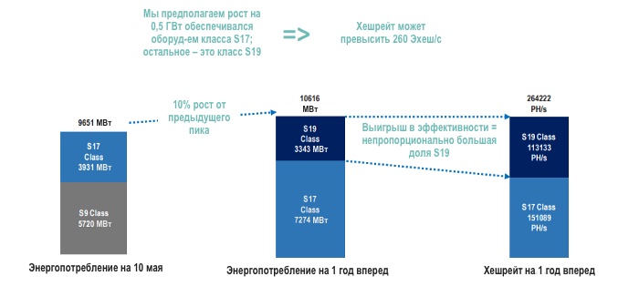 По нашим оценкам, хешрейт Биткойна в следующие 12–14 месяцев может превысить 260 экзахеш/сек., что приведет к небольшому увеличению доступной энергетической мощности с 9,6 до 10,6 ГВт и циклу обновления, в результате которого более старое оборудование класса S9 будет заменено устройствами классов S17 и S19. Рост энергетической мощности основан на доступной мощности в местах майнинга, планируемых расходах на инфраструктуру и мнении о том, что в некоторых локациях с наибольшей стоимостью майнинга майнеры могут оказаться вынуждены сворачивать свои предприятия под давлением сокращающихся доходов.