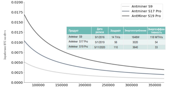 На диаграмме ниже показаны биткойны, зарабатываемые на МВт-ч, для каждого класса устройств: майнеры S19 могут заработать почти в 3 раза больше BTC на МВт-ч, нежели S9.