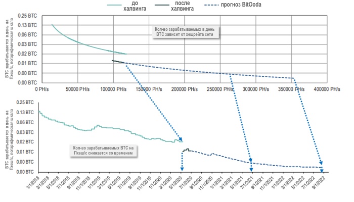 На диаграмме ниже показано, как менялось (и, предположительно, будет меняться) количество получаемых BTC на петахеш/сек. в зависимости как от хешрейта сети, так и от времени, и с учетом награды за блок до и после халвинга. И здесь тоже можно наблюдать снижение доходности в BTC. При рассмотрении этого вопроса вне зависимости от устройств, основываясь только на петахеш/сек., ясно, что ключевым элементом устойчивого роста хешрейта с течением времени является цена.