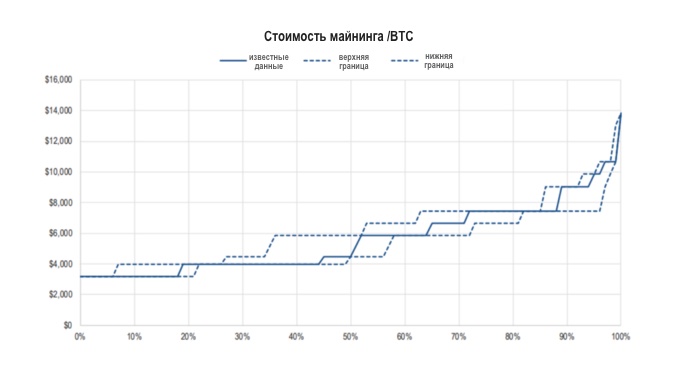 Исходя из нашей оценки кривой затрат, средняя денежная стоимость майнинга 1 BTC составляет около 5000 $, с верхней доверительной границей около 6000 $. Эта оценка включает денежные операционные расходы без учета амортизации или иных затрат на майнинговое оборудование.