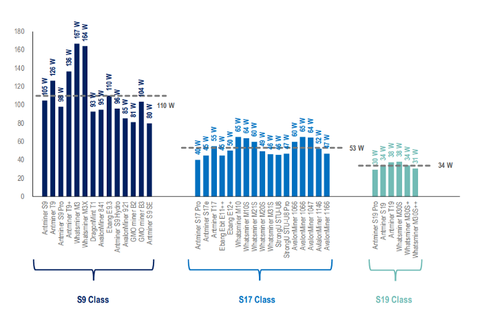 Samsung недавно объявили (англ.) о том, что планируемое коммерческое производство на 3-нм функциональных узлах, вероятно, будет отложено до 2022 года, а основу производства в 2021 году, скорее всего, составят 5-нм узлы. Мы полагаем, что нехватка 3-нм оборудования, вероятно, приведет к тому, что 5-нм узлы составят основу разработки и производства ASIC и до 2022 года. По этим причинам мы рассчитываем, что оборудование класса S19 в ближайшие 24 месяца будет составлять большую часть поставок, хотя постепенные конструктивные улучшения могут привести к повышению эффективности, что может найти отражение в появлении новых модельных рядов.