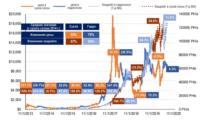 Доступные и недоиспользуемые энергетические мощности, генерация и накопление капитала внутри отрасли (чему способствует гидросезон в Китае) и внешнее финансирование, а также снижение прибыли на петахеш/сек. – все это играет роль в будущем росте хешрейта. Будущее хеша мы рассмотрим в третьей части статьи.