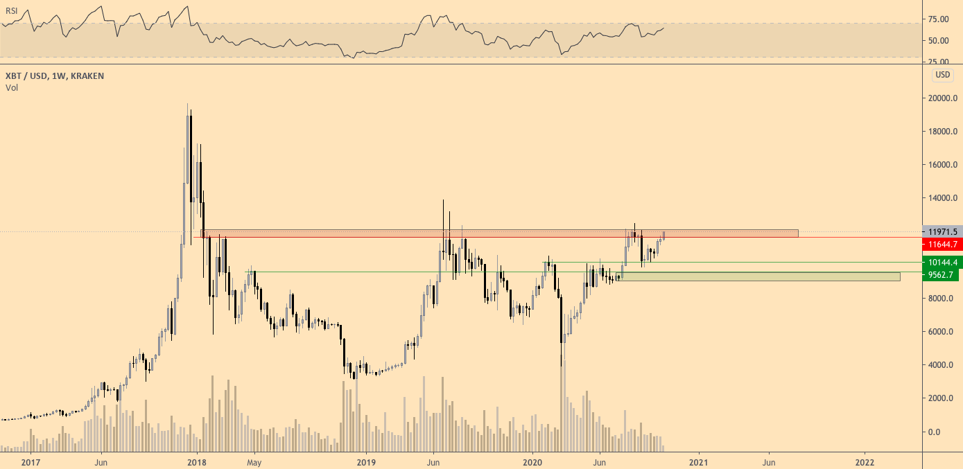 На недельном графике ясно виден этот критический уровень, служивший препятствием для цены BTC в предыдущие годы. Это сопротивления в области $11.700–$12.300. В случае прорыва этого уровня, скорее всего, можно ожидать сильного движения к $17.000.