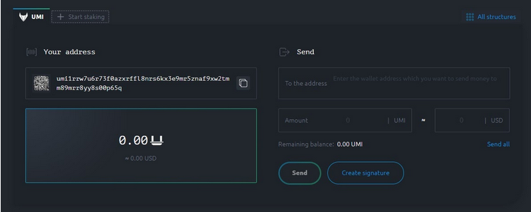 Сейчас добывать монеты UMI можно в двух структурах по стейкингу (пулах) — РОЙ Клубе и ISP Club. Для этого необходимо создать персональный кошелек в блокчейне UMI, перевести на свой адрес определенное количество монет UMI.