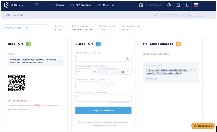 Перед началом пользования кошельком нужно сгенерировать собственный уникальный адрес, который в дальнейшем навсегда закрепляется за клиентом. После этого становится доступным ввод TON Crystal. Вывод монет в целях безопасности возможен только после того, как вы пройдете двухфакторную аутентификацию. Процедуру KYC проходить не нужно, так как с фиатными счетами напрямую платформа не работает.