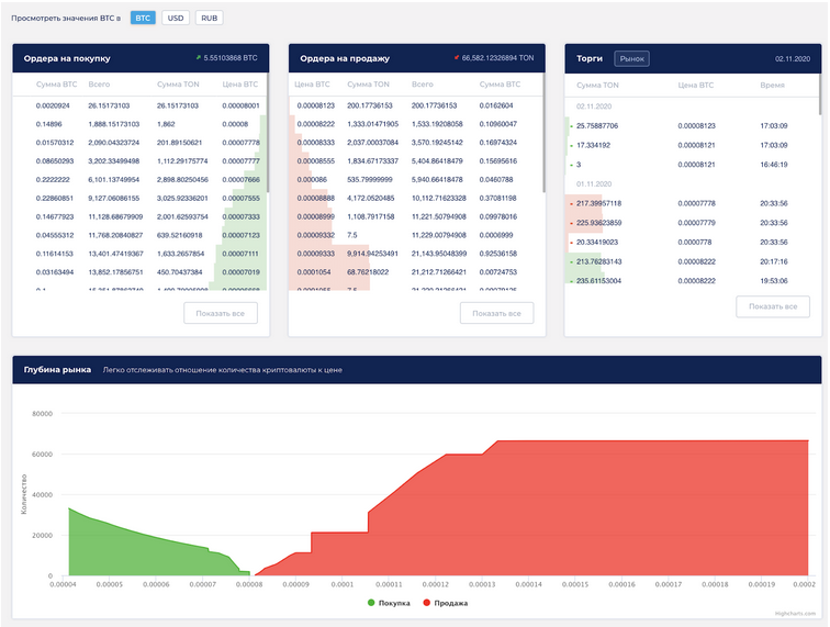 Как видно из скриншотов на момент написания статьи ордеров на покупку TON на 5,55 биткойнов (~75,000$), а ордеров на продажу на 66,500 TON (~72,500$). А объем торгов на бирже за 3 недели составил почти 145,000 TON.
